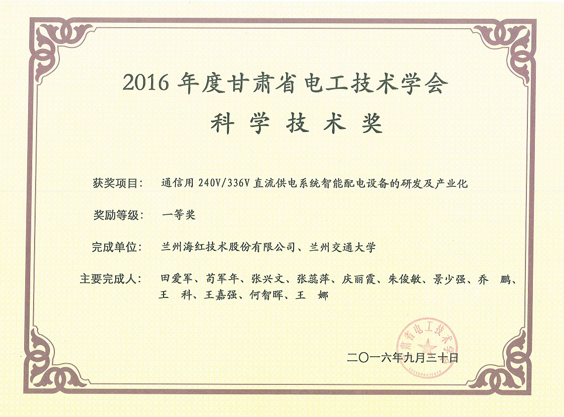 我公司“通信用240V/336V直流供电系统智能配电设备的研发及产业化”项目荣获2016年度甘肃省电工技术学会科学技术奖一等奖