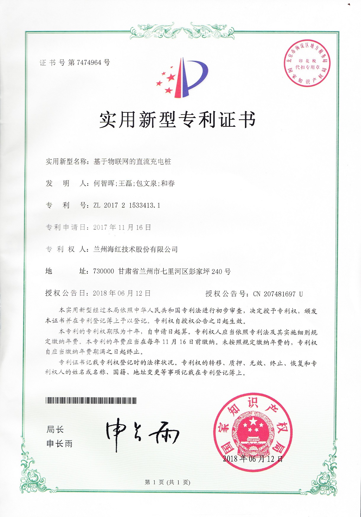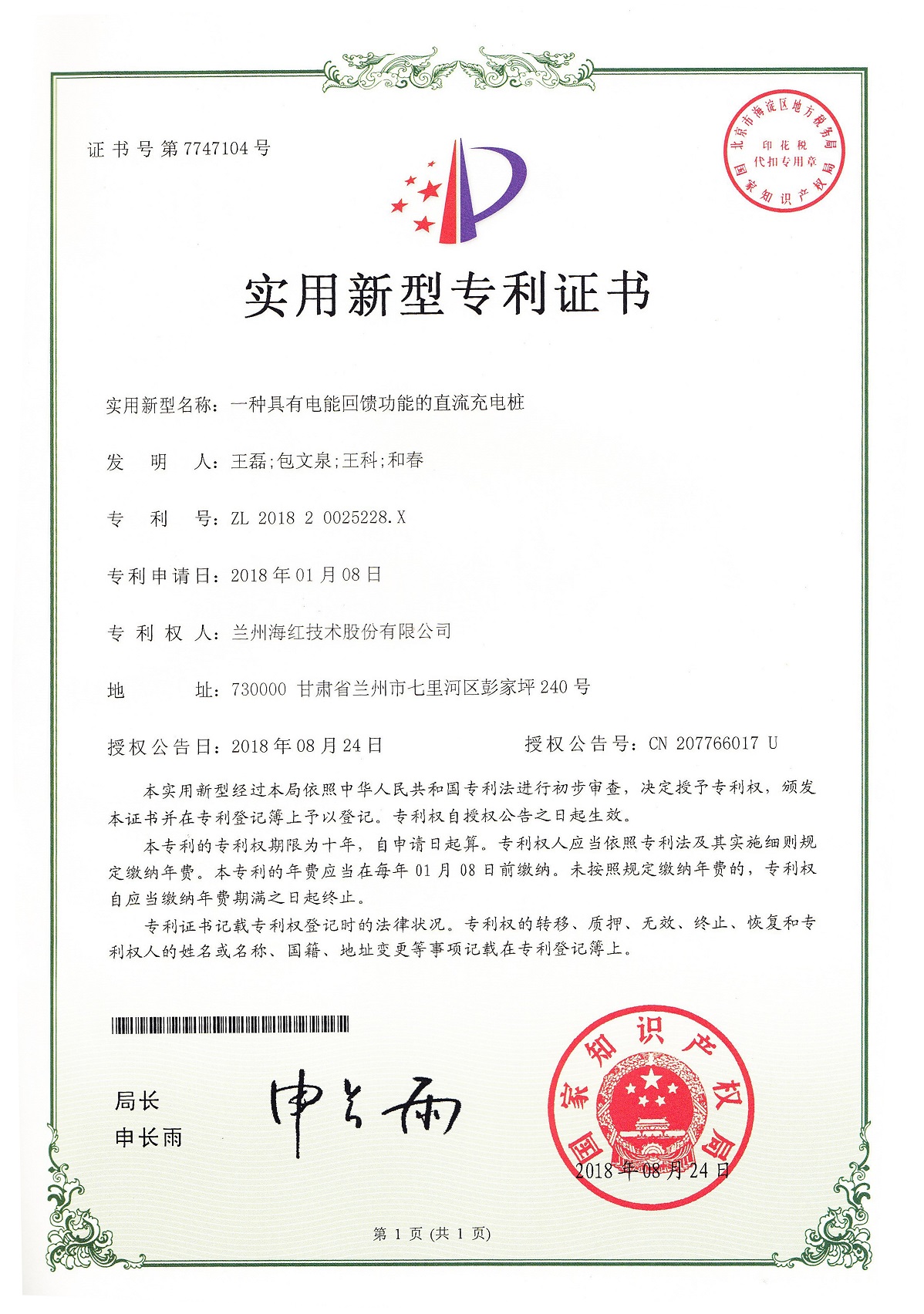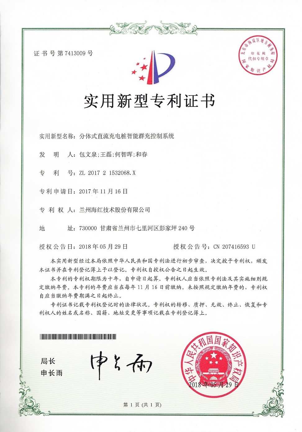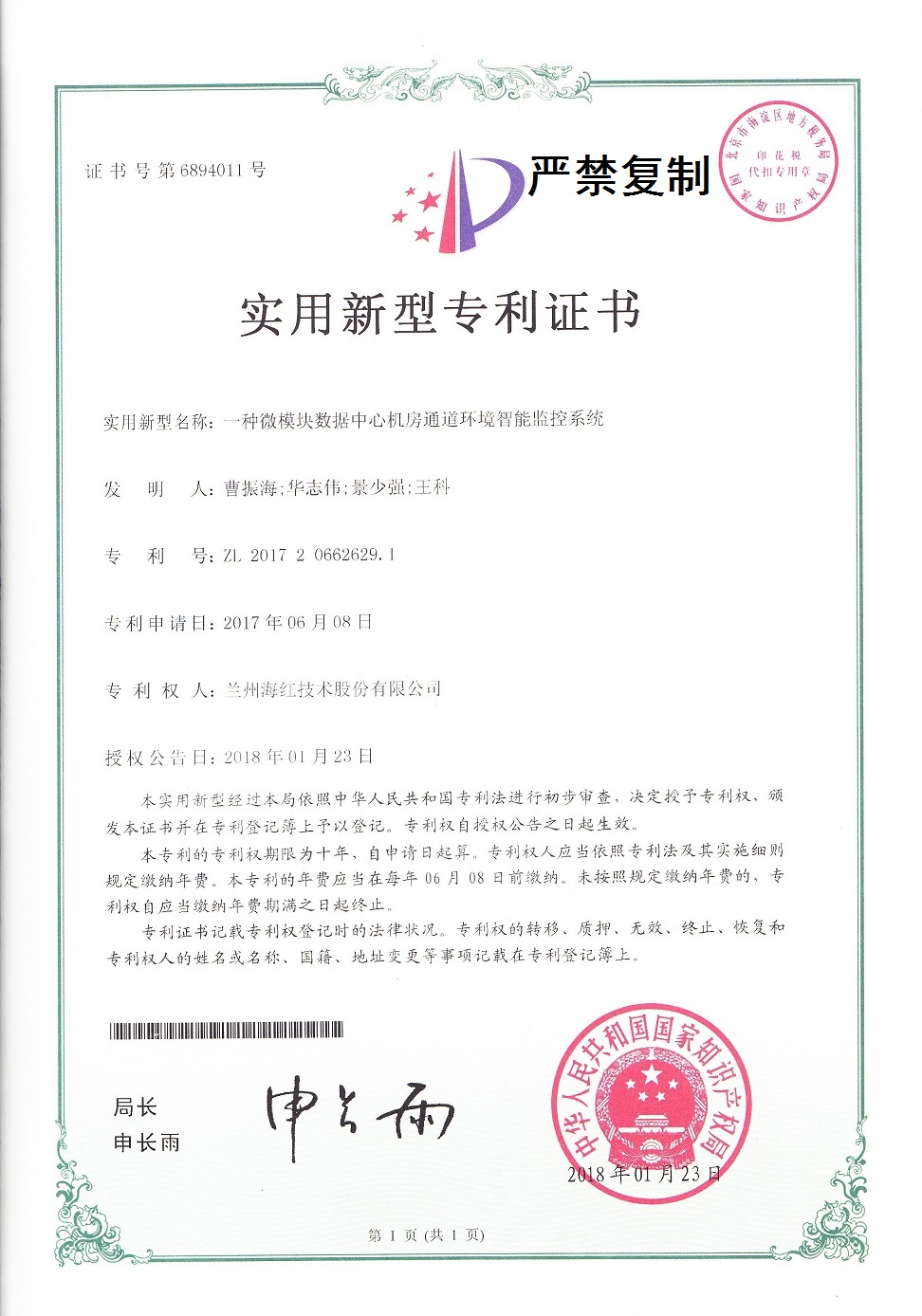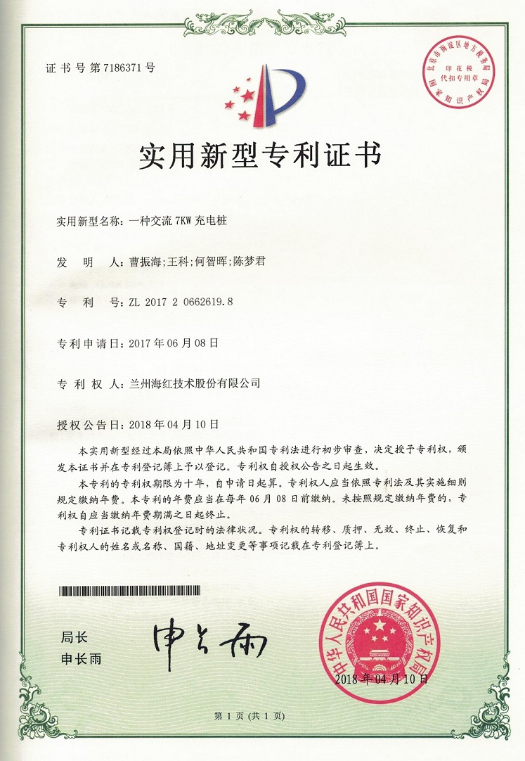 我公司又取得四项实用新型专利,至此我公司申请受理的专利数累积84项(其中发明专利17项,实用新型专利56项,外观设计专利3项,软件著作权8项),已获得授权59项(其中发明专利8项,...