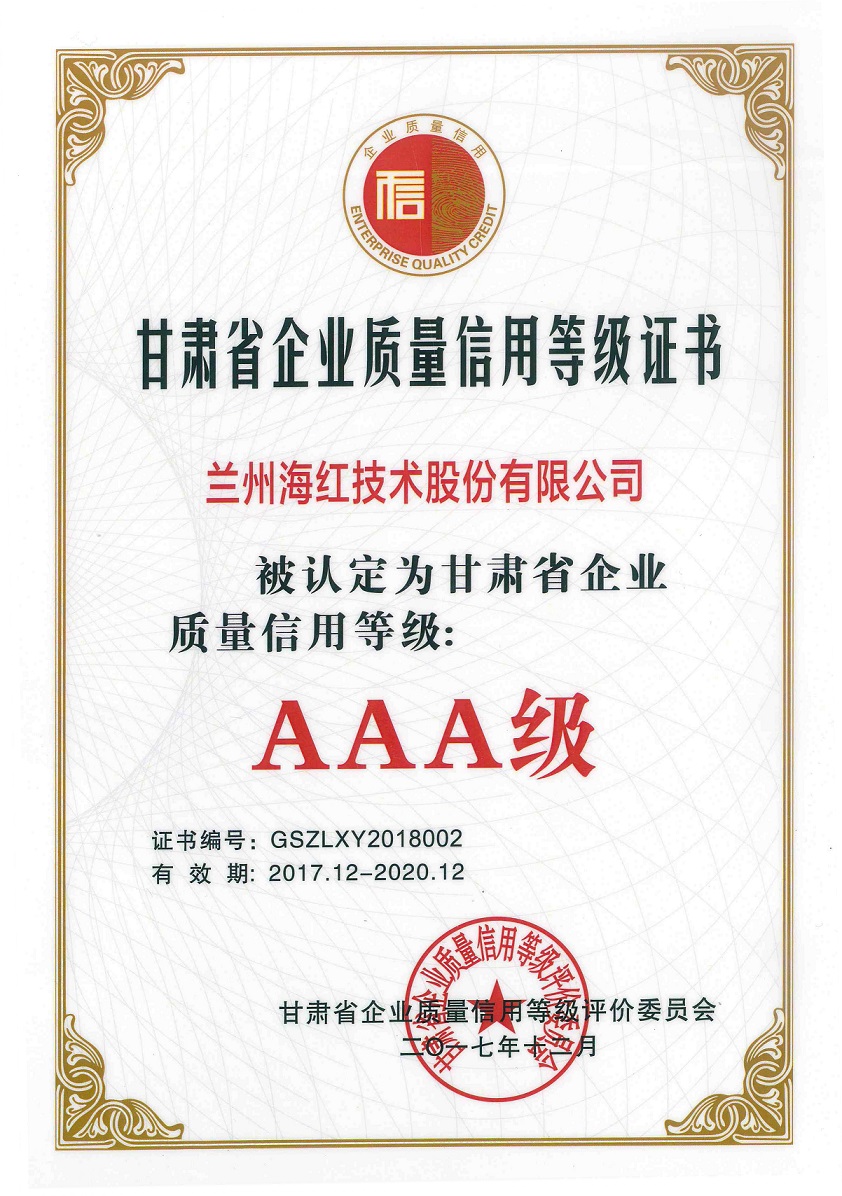 我公司被甘肃省企业质量信用等级评价委员会认定为甘肃省企业质量信用等级AAA级企业。