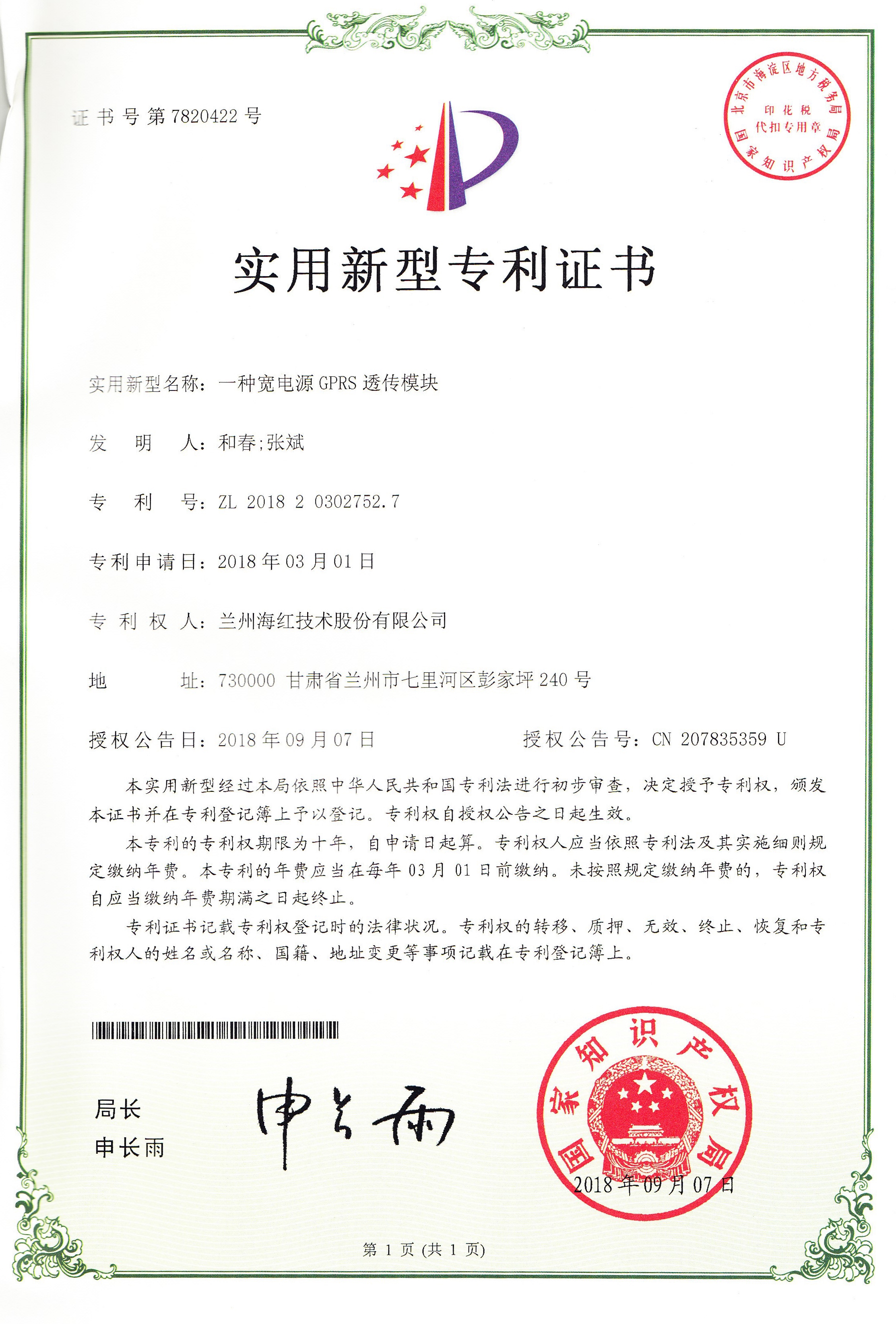 我公司又取得二项实用新型专利,至此我公司申请受理的专利数累积99项(其中发明专利28项,实用新型专利60项,外观设计专利3项,软件著作权8项),已获得授权74项(其中发明专利8项,...