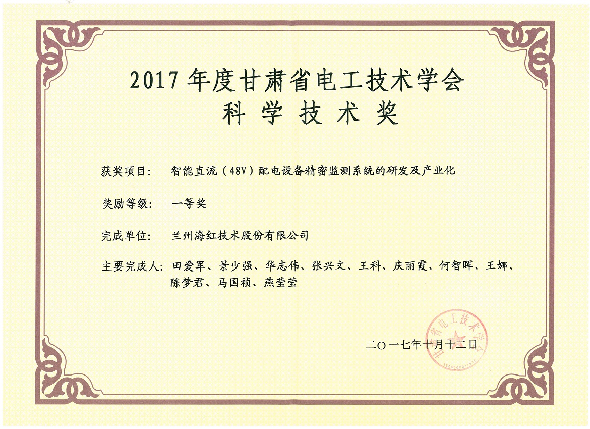 我公司“智能直流(48V)配电设备精密监测系统的研发及产业化”项目荣获2017年度甘肃省电工技术学会科学技术一等奖。