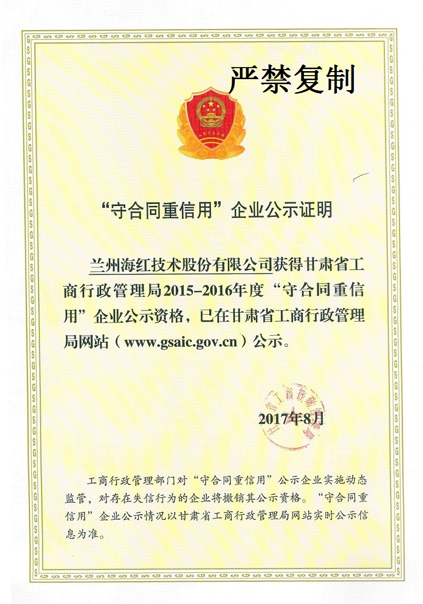 我公司及子公司(海源科技)分别荣获2016年度甘肃省、兰州市、兰州高新区“守合同、 重信用”企业荣誉称号