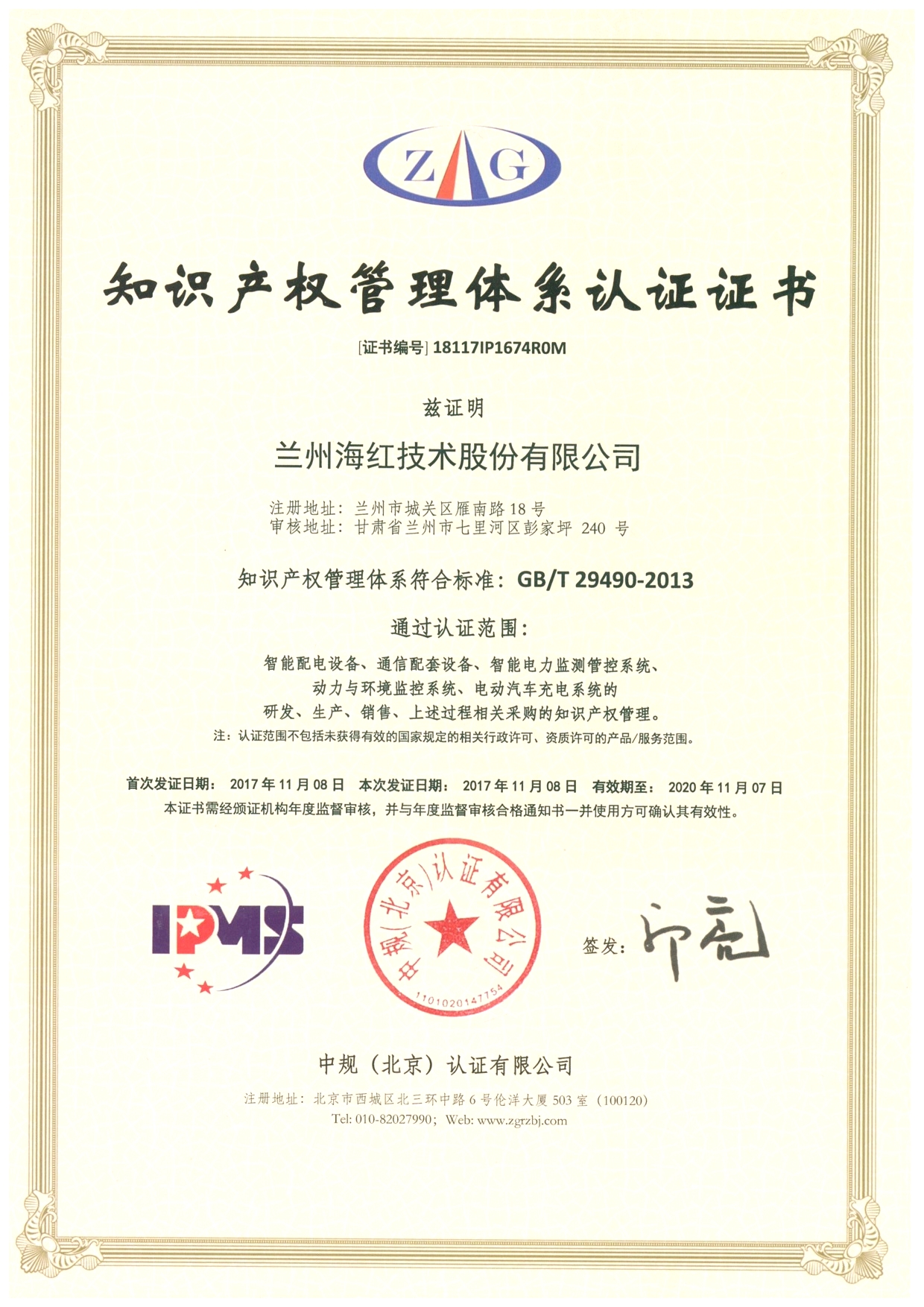 2017年10月20日至21日,我司以完整规范的知识产权管理体系顺利通过了中规(北京)认证有限公司审核组现场评估审核,并于11月8日取得认证证书。同时,我司也成为甘肃省第二家通过“...