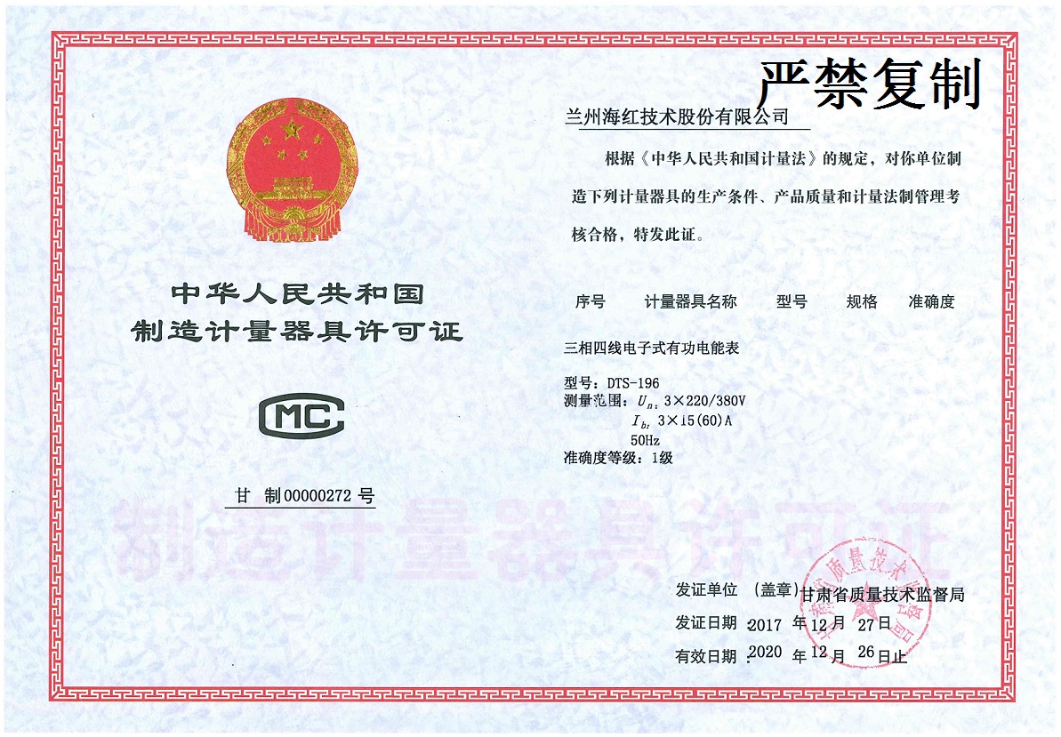我公司生产制造的“三相四线电子式有功电能表”产品,经甘肃省质量技术监督局的现场审核,生产条件、产品质量和计量法制管理考核合格,通过CMC认证,取得制造计量器具许可证。