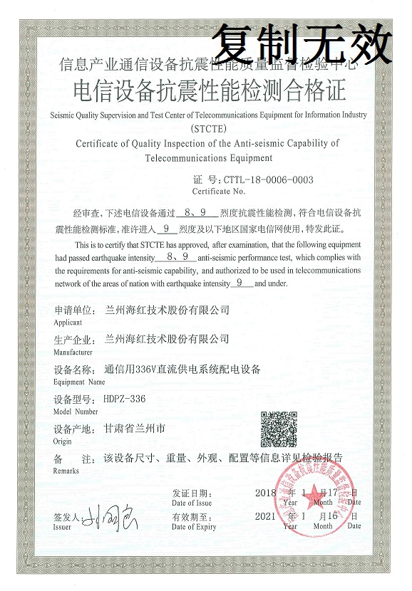 我公司“通信用336V直流供电系统配电设备”产品取得电信设备抗震性能检测合格证