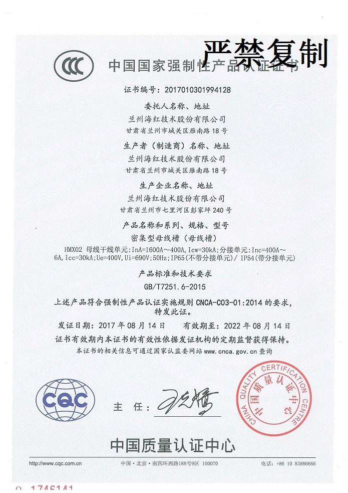 我公司又有两个产品取得CCC证书、一个产品取得检验报告 By FUN88乐天使在线登录技术 2017-08-31 00:00:00 0次 我公司的“密集型母线槽 (HMX01型)与密集型母线槽 (HMX02型)”产品通过中国质量认证中心的CCC认证并取得证书。至此,我公司共取得14个产品的CCC认证证书。 我公司的“背板式温控设备(HJZL-01)”产品取得中国泰尔实验室的委托测试测试报告。至此,我公司共取得32个产品的试验检验报告。 上一篇:兰州市工信委党组书记、主任王正祥一行莅临我公司调研指导 下一篇:我公司设计中心被认定为“省级工业设计中心”