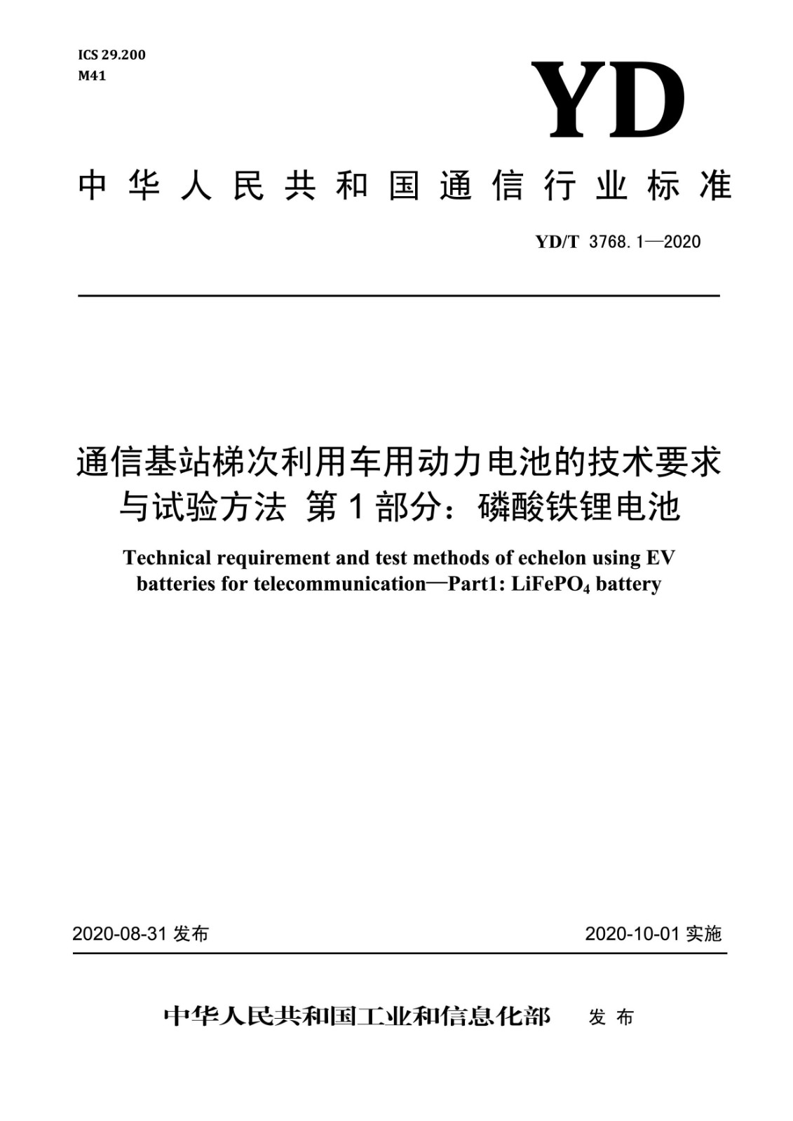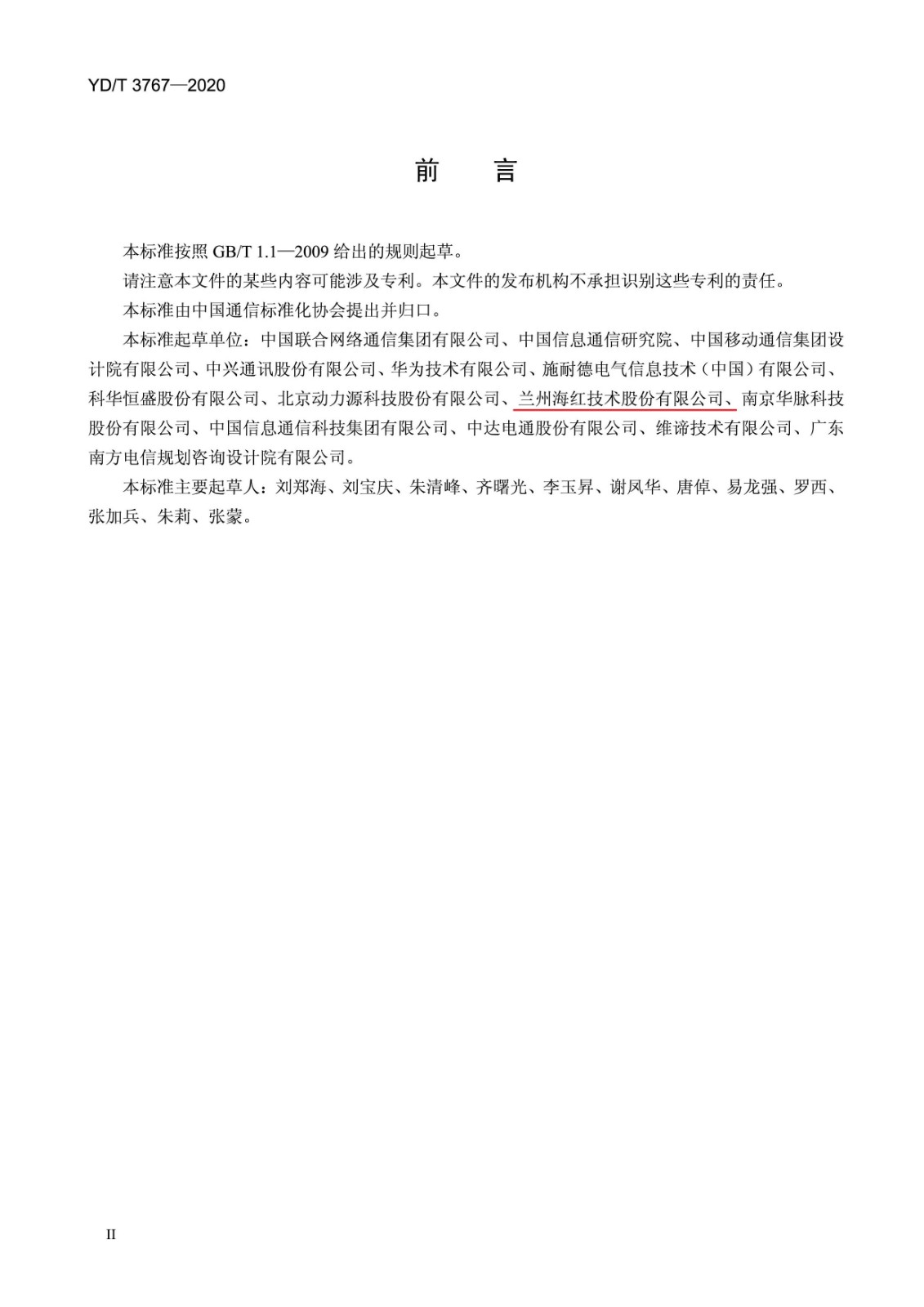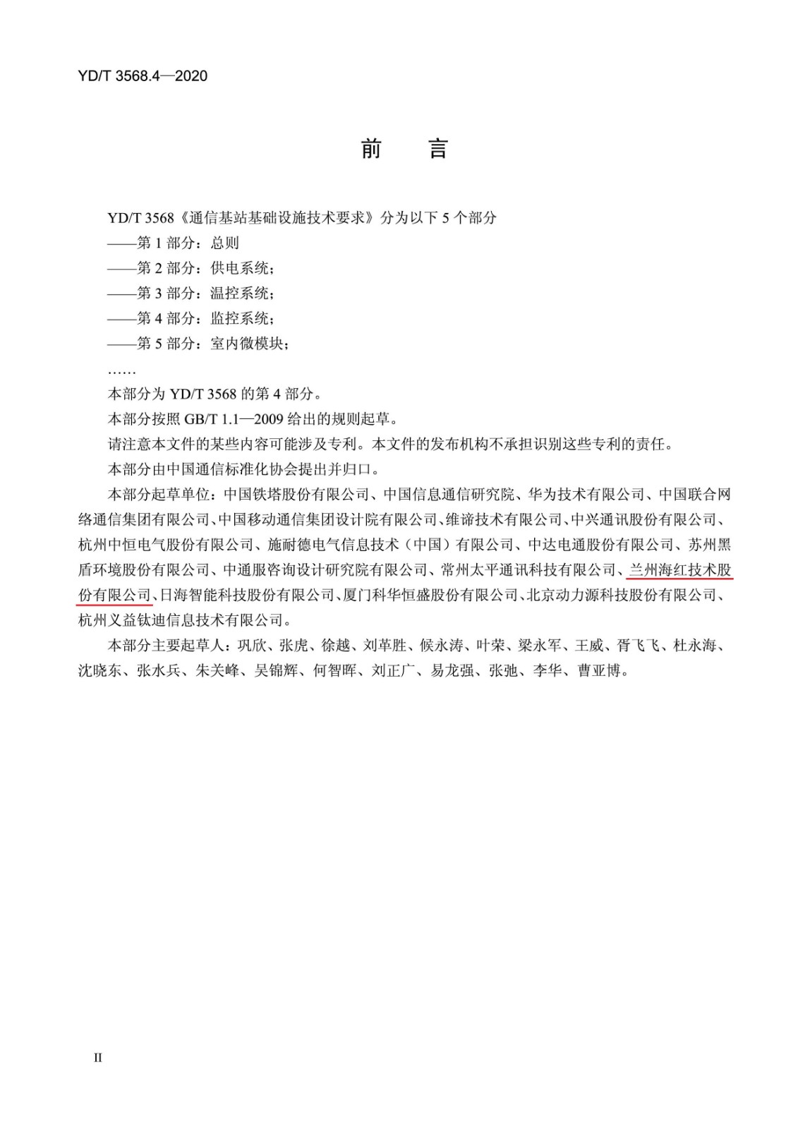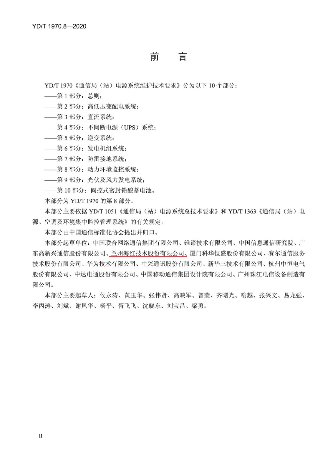 我司参与起草的《通信局(站)电源系统维护技术要求 8 部分:动力环境监控系统》(YD/T 1970.8-2020)、《通信基站基础设施技术要求第 4 部分:监控系统》(YD/T 3568.4-2020)、《通信基站梯次利用车用动力电池的技术要求与试验方法第 1 部分:磷酸铁锂电池》(YD/T 3768.1-2020)、《数据中心用市电加保障电源的两路供电系统技术要求》(YDT3767-2020)四项行业标准经中华人民共和国工业和信息化部批准发布,前两项已于20200701日实施,后两项已于20201001日实施。以上标准是继《通信电源和机房环境节能技术指南第5部分:气流组织》、《网络机柜用分布式电源系统》、《通信电源和机房环境节能技术指南 2部分:应用条件》、《通信用240V直流供电系统使用技术要求》、《通信局(站)电源系统总技术要求》、《通信用240V/336V直流配电单元》、《通信机房用光纤槽道》、《通信基站基础设施技术要求 3部分:温控系统》、《通信基站基础设施技术要求 1部分:总则》、《通信基站基础设施技术要求 2部分:供电系统》十项标准之后,由我司参与起草正式出版的第11项、第12项、第13项、第14项行业标准。