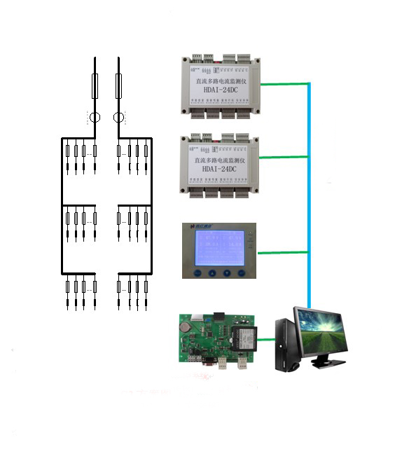 该系统主要用于需要对直流配电设备的配出支路电量进行监测的智能配电设备中,不仅具有主备双路母线电量与配出支路的开关状态实时监测功能,而且具有对配出支路的电量、电能进行监测。